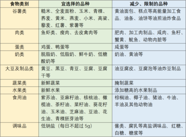 平衡膳食,食物多樣,食物種類每日不少于12種,每周不少于25種。應(yīng)攝入充足蛋白質(zhì),選擇脂肪含量較低的魚蝦、去皮禽肉、瘦肉等,奶類可選擇脫脂或低脂牛奶。提高大豆蛋白的攝入,每日攝入25g大豆蛋白,可降低心血管疾病的發(fā)生風險。