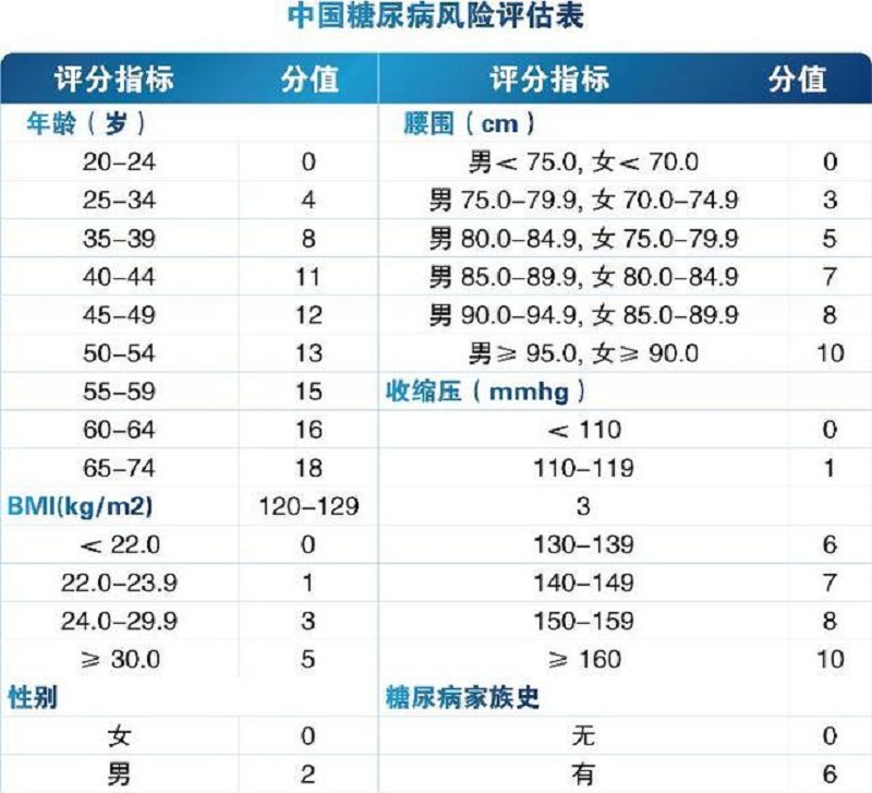 中國糖尿病風(fēng)險評估表:根據(jù)下表計(jì)算分?jǐn)?shù),了解你是否有換上二型糖尿病的風(fēng)險,風(fēng)險評估數(shù)值<25,低風(fēng)險;≥25,高風(fēng)險;
